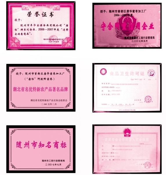 公司始终坚持以产品质量拉动市场营销、以合理定位抢占蜜枣市场的发展战略,不断该进工艺水平,提高技术含量,强化质量保障,所加工生产的金黄蜜枣和阿胶蜂蜜枣,除满足随州市的广大消费者需求外,目前已与武汉中百集团、中商集团、上海梅林集团形成长期供货关系,远销华中和华南十多个大中城市及香港地区,并先后荣获“湖北省名优状新农产品著名品牌”、“随州市重合同守信用企业”、“随州市知名商标”、“湖北省著名商标”等荣誉称号。