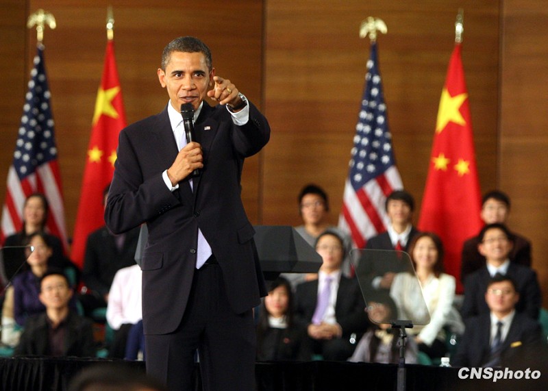 奥巴马在上海科技馆与四百余中国青年进行面对面交流。