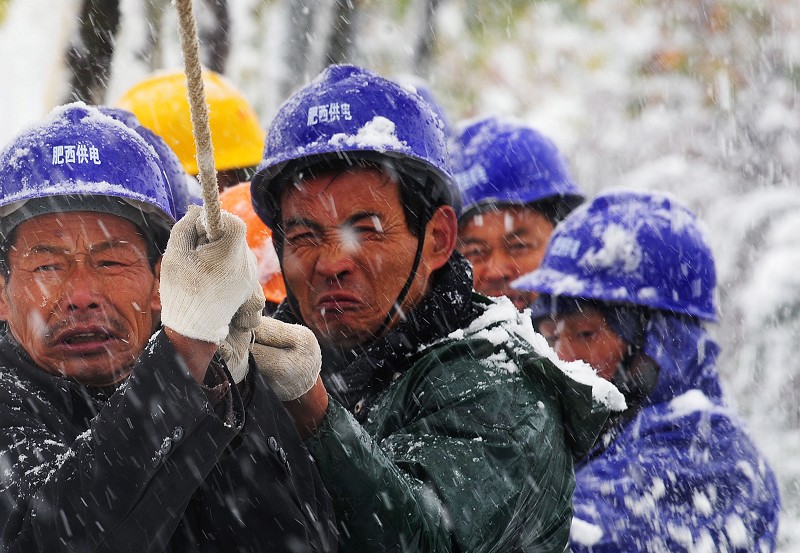 十一月十六日,安徽省肥西县供电部门的工作人员冒着大雪在该县烟墩乡进主线路的紧急抢修。当日,安徽大部分地区普降大雪,交通、电力和通讯等多方面受到影响。安徽发布暴雪橙色预警。(新华社发)