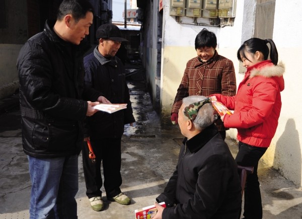 十一月十八日,曾都区东城办事处舜井社区居委会工作人员挨门挨户向社区居民发放《湖北民众防灾应急手册》,帮助居民增加预防雪灾、火灾等自然灾害和应急、急救知识。(本报记者 李文军 通讯员 陈立馗 摄)