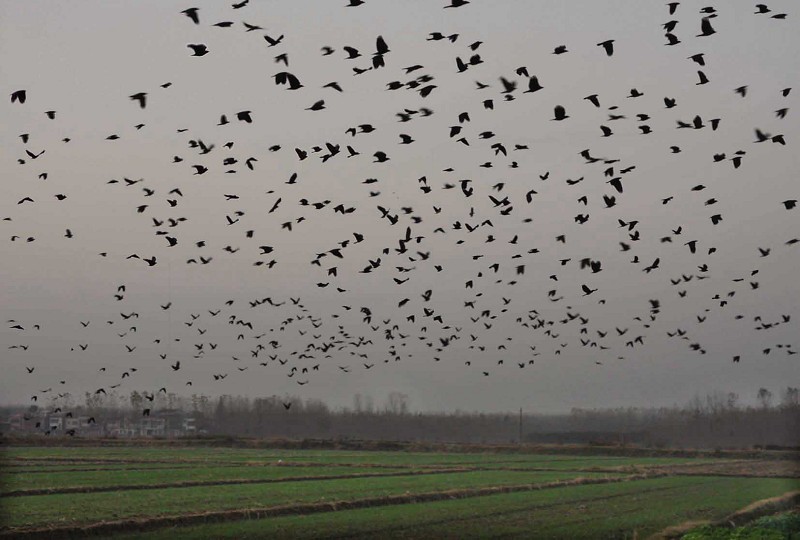 11月14日下午,天色渐暗,数万飞鸟在随州经济开发区淅河镇桥头村麦田上空盘旋向东南而去,它们时而俯冲,时而追逐,场面极其壮观。据村民介绍,它们可能是从北方到这里过冬的候鸟。 (本报记者 杨闻名摄)