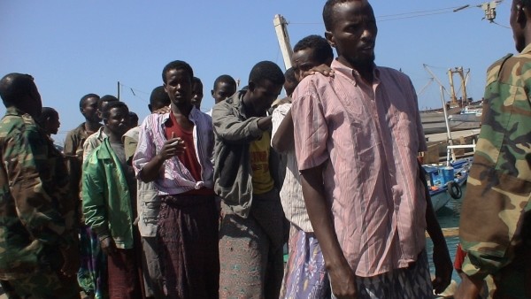 11月19日,被西班牙海军抓获的几名索马里海盗嫌疑人在索马里东北部港口博萨索。当天,西班牙海军将这12名嫌疑人移交给当地政府。 (新华社发)