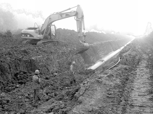 西气东输二线主干路线由河南唐河、枣阳进入我市唐县镇石佛,总长102公里,已于5月18日开工,预计总投资21.6亿元。图为随县唐县镇沙子岗的西气东输二线工程施工现场。 (章双庆 摄)