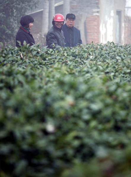 随县安居沙湾农民利用大田种茶叶取得实效。村民们说,大田种茶的收入,是种植一般农作物的好几倍。图为村民在介绍大田种茶经验。 (本报记者 孙洪涛摄)