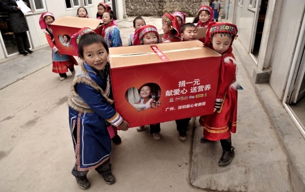 12月4日,北川桂溪平安希望小学二年级羌族学生将全校每天每人一份的免费课间营养餐抬进教室。当日,从全国15个城市选出的爱心消费者代表,参加了由中国扶贫基金会等单位与联合国世界粮食计划署共同倡议发起的 “每人捐一元钱,为灾区儿童健康成长奉献爱心活动”启动仪式。 (新华社发)