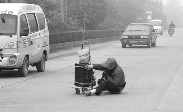 昨日,在随城清河路马路中间,一个乞讨者在过往车流中乞讨。一些市民认为:这种行为对交通和市容都会造成影响。 (本报记者 杨闻名摄)
