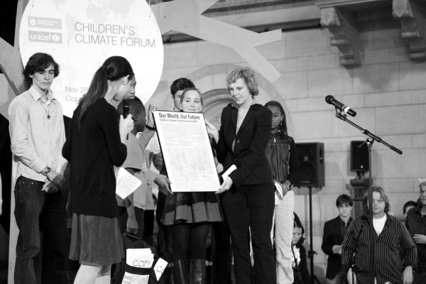 12月4日,在丹麦首都哥本哈根举行的“儿童气候论坛”闭幕式上,各国青少年代表将他们在此次论坛发表的《儿童气候宣言》递交给哥本哈根气候变化大会主席、丹麦气候与能源大臣康妮·赫泽高。包括中国在内的44个国家和地区的160名青少年代表参加了为期一周的“儿童气候论坛”。 (新华社发)