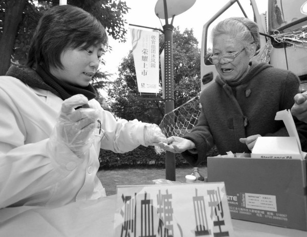 12月5日,贵阳市医疗卫生系统的志愿者在启动仪式现场为老人进行免费体检。