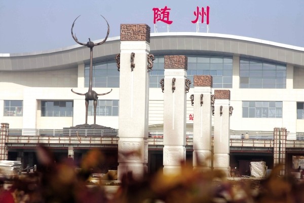 12月5日,具有随州地方文化特色的新火车站广场工程建设近尾声。11米高的青铜鹿鹤和分别高6.5米、宽1.09米的8根文化柱耸立在广场中心,它们造型别致,独具特色(上图)。