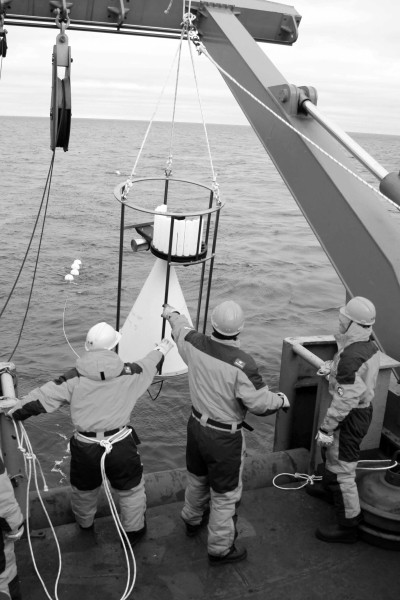 12月6日,科考队员正在将锚系潜标系统投入海中。当日,中国第26次南极考察队在距中国南极中山站约60海里的普里兹湾海域布放一套锚系潜标系统,这是中国首次在南大洋开展潜标观测,将有助于为全球气候变化寻找依据。(新华社发)