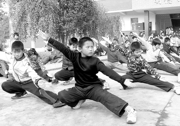 随县尚市镇净明小学在学生中广泛开展武术、健美操等特色体育活动,极大地激发了学生们参与体育锻炼的热情,丰富了阳光体育运动的内涵,收到良好效果。图为武术小组的学生们正在一招一式地认真练习。 (本报记者 张 顺摄)