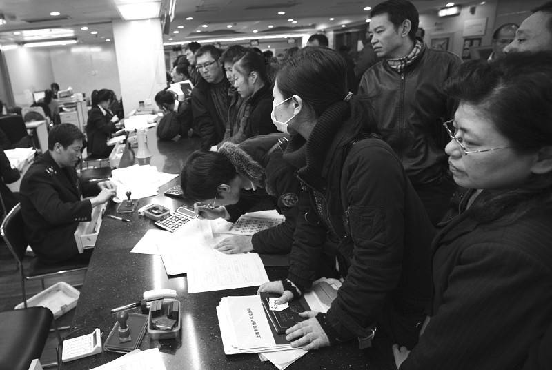 12月10日,二手房买卖双方在上海徐汇区房地产交易中心办理过户手续。随着二手房营业税优惠政策即将到期,上海各区县房地产交易中心交易量明显增加。12月9日,国务院常务会议决定个人住房转让营业税征免时限由2年恢复到5年,买卖双方为了节省“2变5”之后多花的5.5%的税费成本,纷纷赶在年底之前完成交易。 (新华社发)