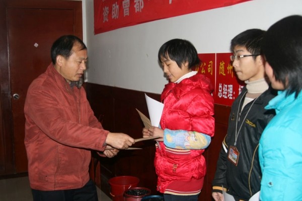 12月8日,曾都区工商联组织宏力、源丰等4名企业家向曾都一中12名贫困生进行资助。图为捐赠现场。 (本报记者 徐军国摄)