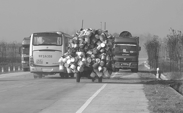 12月9日,记者在绕城公路看到一辆拖满油漆桶的三轮摩托车,所拖之物远远超过车辆本身的“个头”。 (杨闻名 摄)