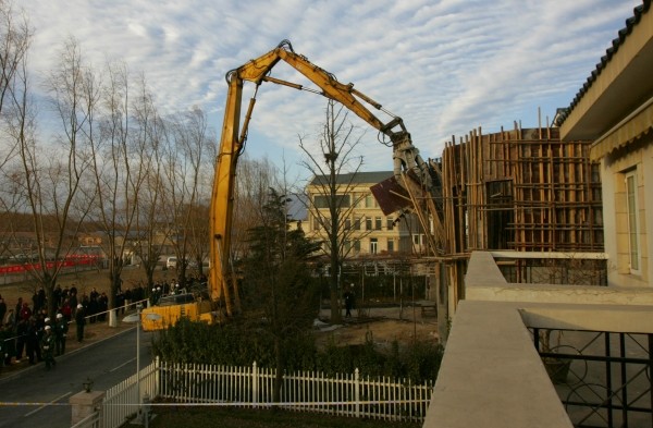 12月11日,在北京海淀区上庄镇翠湖小区,执法人员动用大型机械拆除一座别墅违法扩建部分。当日,北京海淀区上庄镇翠湖小区现场拉上警戒线,两辆大型机械车开进小区,一位亿万富翁、企业老总所属别墅违法扩建的部分被海淀区政府强制拆除。 (新华社发)