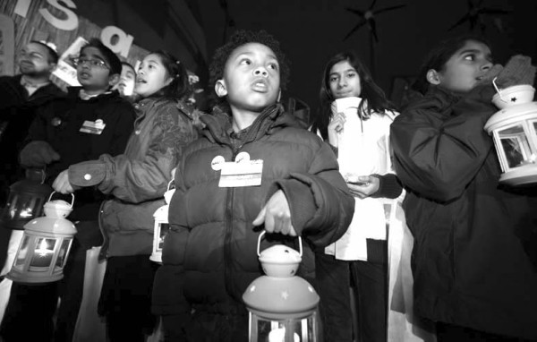 12月12日,在位于丹麦首都哥本哈根的联合国气候变化大会会场贝拉会展中心,孩子们参加烛光守夜活动。当天,这里举行了一场特别的烛光守夜活动,提醒人们关注全球气候变暖带来的挑战,呼吁尽快采取行动,敦促正在这里举行的联合国气候变化谈判尽快达成协议。 (新华社发)