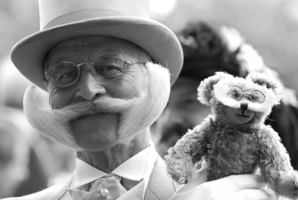 ③ 9月19日,在德国世界胡须锦标赛上,一名男子拿着一个留着相似“胡子”的玩具小熊展示他的胡须。