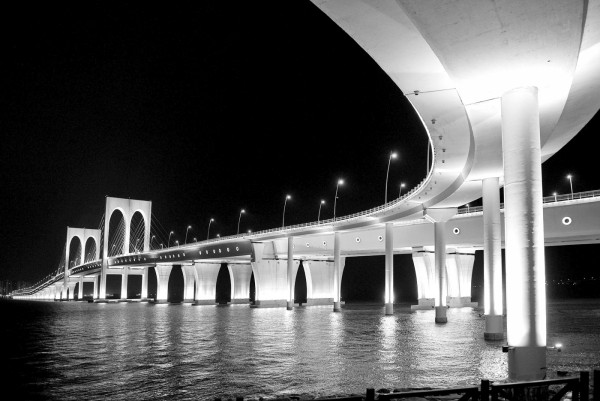 灯光璀璨的澳门西湾大桥澳门理工学院夜景游人在澳门大三巴牌坊观光