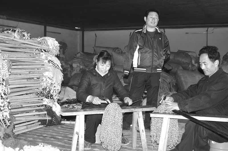 最近,身残志坚的李丰强自筹资金在随州城区办起拖把厂,吸纳了13名残疾人和下岗工人在该厂就业,日生产拖把200余个。他说:“我要用自己的行动回报社会。” (徐军国摄)
