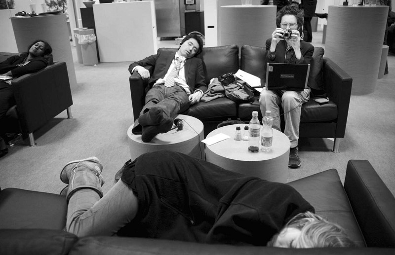 12月 19日凌晨,在气候变化大会会场内,人们在沙发上休息。原定于18日结束的气候大会迟迟未能结束。(新华社发)