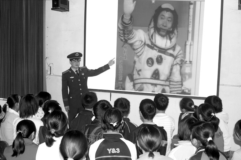 随县万和镇中心学校努力创建书香校园,经常对学生开展一些科技、国防、防震等科普知识教育。培养学生热爱科技知识,提高学生的创新思维能图表。图为驻地军人给学生们讲国防科普知识。
