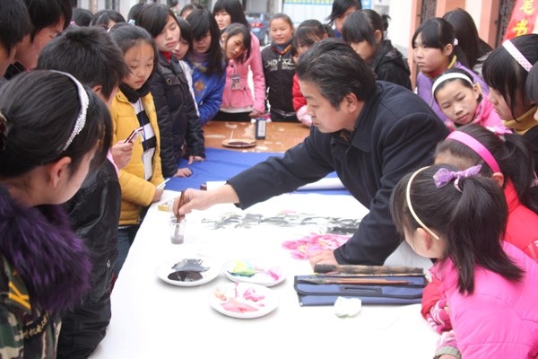 12月26日,随州机电工程学校举办了以“魅力机电文化校园”为主题的书画作品展,以此形式迎接新一年的到来。图为该校书画老师在为学生作即兴表演。 (本报记者 杨闻名 通讯员 刘正主摄)
