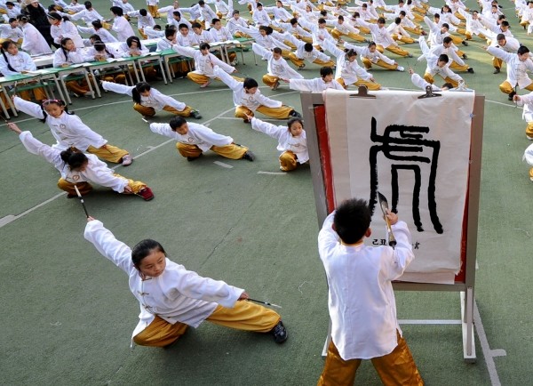 ⑤ 南京市珠江路小学的学生在进行“书法操”及书法展演。当日,“全国写字实验学校”南京市珠江路小学的师生在迎元旦文体活动中展示了该校新创的特色课程“书法操”。