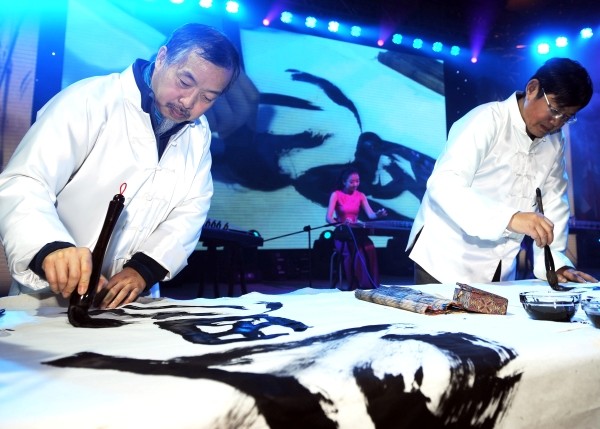 ① 在中国长春瓦萨国际滑雪节“瓦萨之夜”新年晚会上,来自台湾和吉林的几位书法家挥毫泼墨,寄语新年,共同迎接元旦的到来。