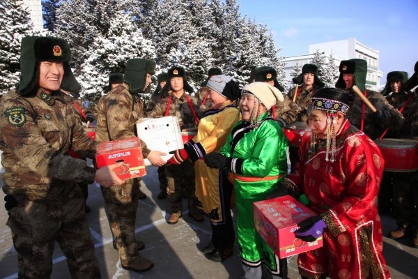 ⑥ 12月31日,鄂伦春族群众来到部队慰问。当日,2010年新年即将来临,居住在大兴安岭十八站鄂伦春民族自治乡的鄂伦春族群众,冒着零下40摄氏度的严寒来到边防某部驻地,慰问驻守在这里的部队官兵。