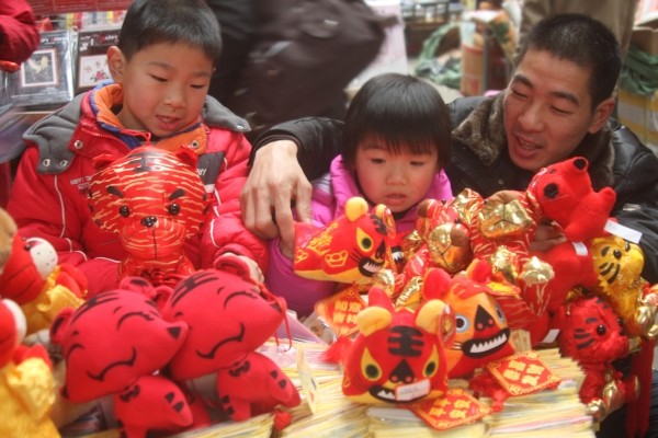 图2:1月3日,市民柳杨带着他的一对儿女在街头购买虎年饰物。元旦期间,随城处处洋溢着浓浓的节日气氛,中国结、灯笼、虎年装饰品等喜庆元素饰品颇受市民青睐。 (本报记者 杨闻名摄)