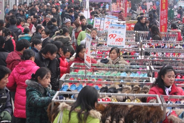 图3:元旦期间,我市各大商场、超市、街头人流如潮,节日商品货丰价稳,市场购销两旺。图为解放路步行街,市民们纷纷趁着服装打折机会购买衣服。(本报记者 杨闻名摄)