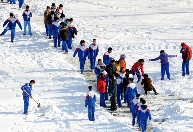 1月5日,北京一所学校的学生课间在积雪的操场上玩耍。当天,因大雪停课一天的北京市各中小学恢复上课。由于遭遇强降雪,北京市政府决定全市各中小学1月4日停课一天。 (新华社发)