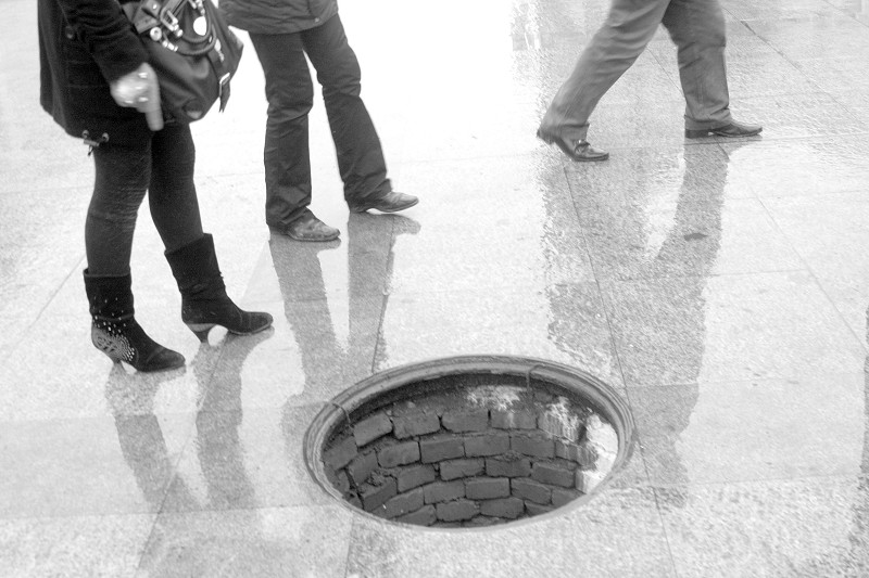 连日来,城区窨井盖频频被盗,令人愤慨。这是记者在老火车站广场附近看到的一个窨井“张开大嘴”,窨井盖不知去向。记者发现,被盗的窨井盖,都是不锈钢或铁质材料,一些水泥材质的井盖却完好。 (本报记者 杨闻名摄)