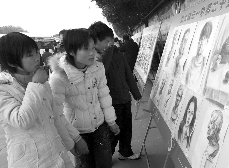在随州一中近日举行的艺术节上,学生们竞相展示自己的艺术特长,交流全面发展、快乐成长的经验体会。图为学生们正在品评同学的美术作品。 (本报记者 张顺 通讯员 叶银品摄)