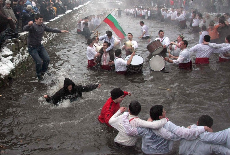 1月6日,在保加利亚卡洛菲尔市,人们在冰冷的河水中跳起保加利亚民间舞蹈霍洛舞,相互祝福在新的一年里身体健康,事事顺遂。 (新华社发)