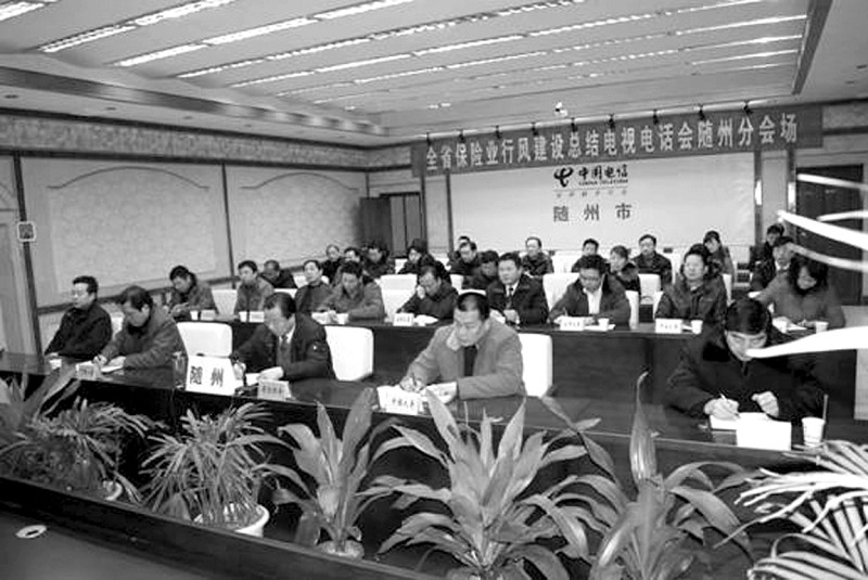 1月8日上午,随州市保险行业老总在电信公司可视电话厅,参加收听收看全省保险业行风建设总结电视电话会。 (罗可友 摄)