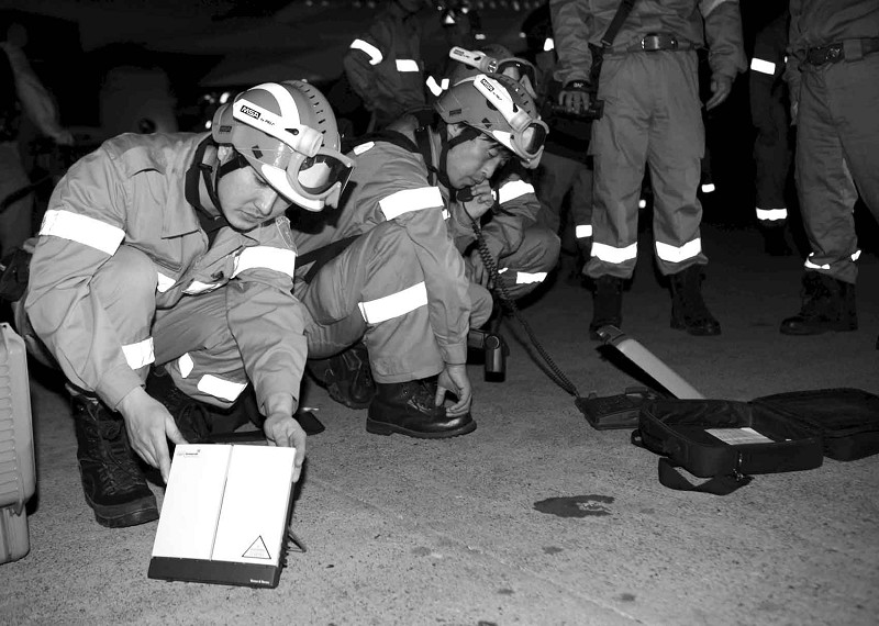 图为:中国救援队队员架设海事卫星进行通讯联系
