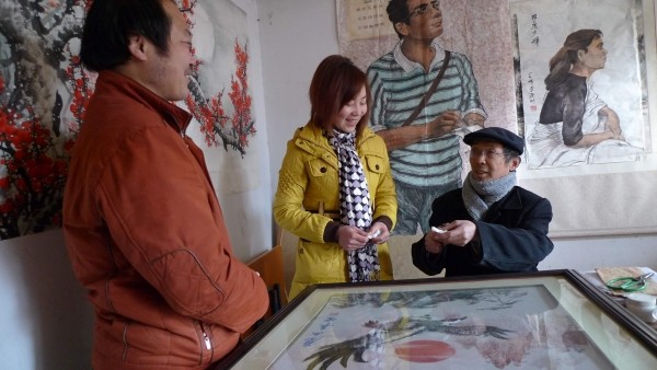 市民间文艺家协会的王炜(右)日前正在向棉花画的爱好者介绍棉花画的制作过程。据介绍,棉花画是用脱脂棉为原料,经过清洗、染色、精制等20多道工序制作完成。它的特点是吸收中国画艺术风格,画面清新柔和、雅俗共赏。