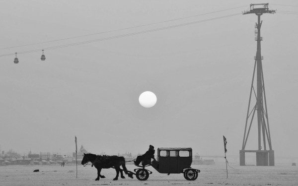 在夕阳下,一辆马车从松花江面上驶过。数九寒天,冰封雪覆的松花江成了哈尔滨市民和游客的天然游乐场。 新华社发