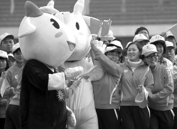 1月16日,参加亚运会倒计时300天庆祝活动的广州市民与亚运会吉祥物在一起。1月16日是广州亚运会倒计时300天。 新华社发