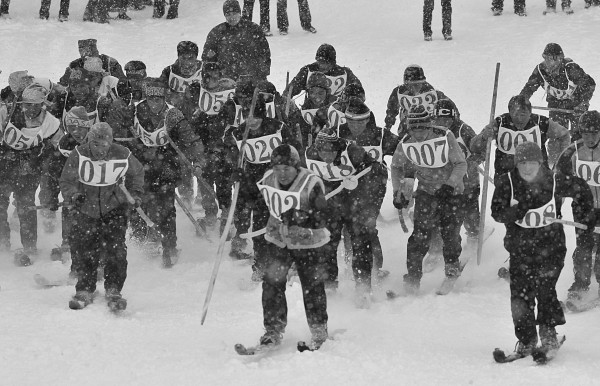 1月16日,来自新疆阿勒泰地区各县市的105名蒙古族、哈萨克族青年,脚蹬毛皮滑雪板参加滑雪比赛。