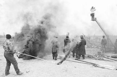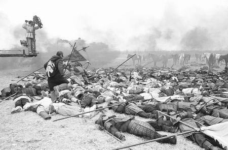 7日,记者和执法人员一起赶到拍摄现场。在现场,记者看到正在拍摄的画面是一场大战之后,将士死伤的场景。上百名演员横七竖八躺在地上,枪、刀、剑、戟和旌旗扔得到处都是,几十匹马在湿地上悲鸣。四个手持火把的人,点燃焰火,湿地上空黑烟滚滚。