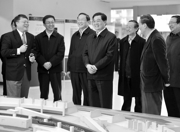 1月14日至17日,中共中央总书记、国家主席、中央军委主席胡锦涛在上海市考察工作。这是胡锦涛在上海同步辐射光源工程考察时,详细了解这一工程的建设、运行和为科学实验提供服务的情况。 (新华社发)