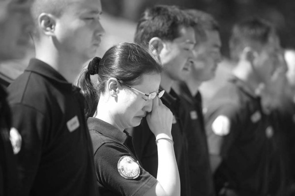 1月16日,在海地首都太子港,中国驻海地维和警察防暴队的官兵在等候运送被埋战友遗体车辆的归来。 (新华社发)