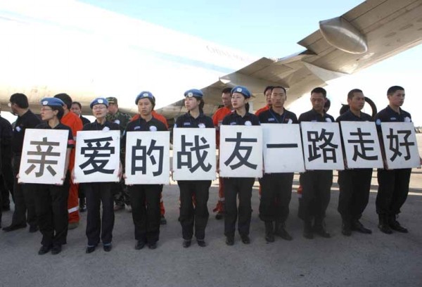 1月17日,中国维和警察防暴队全体队员在海地太子港为遇难者送行。 (新华社发)