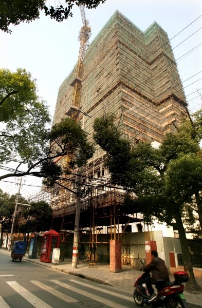 在上海市闸北区彭浦新村,一幢18层的建筑实现结构封顶(2009年12月4日摄)。该建筑的4至18层将全部用作困难群众的廉租房,共有180套。