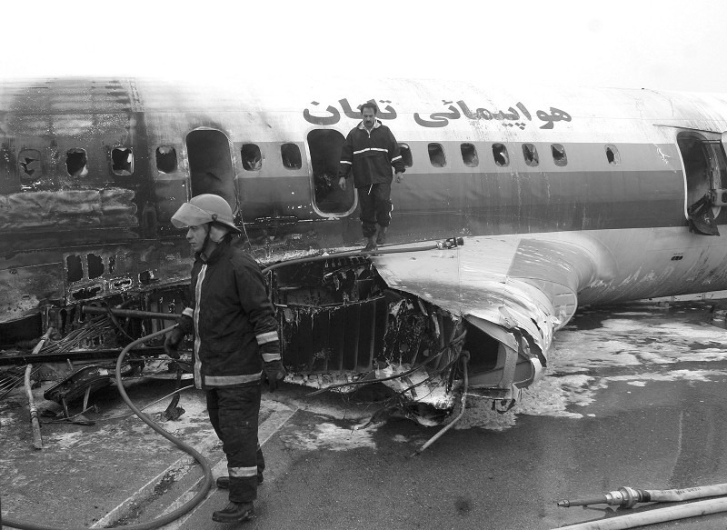 1月24日,在伊朗东北部城市马什哈德机场,消防员在发生事故的飞机旁工作。伊朗一架客机24日在伊朗东北部城市马什哈德的机场降落时着火,造成至少46人受伤。