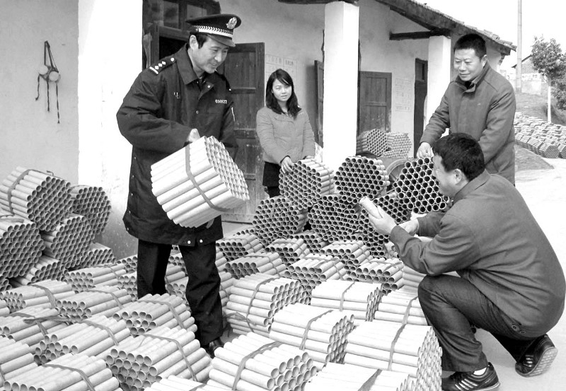 随县淮河镇是全县矿产和涉爆企业较多的乡镇,每年使用炸药数量较大。淮河公安派出所为做好春节期间炸药安全管理工作,每周组织民警到驻地涉爆企业进行安全巡查,发现问题及时整改。图为派出所民警在镇花炮厂检查安全生产情况。 (乐道贤 马刚峰 摄)