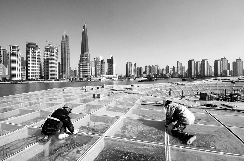 1月26日,工人在即将建成竣工的上海十六铺世博水门施工。近日,2010年上海世博会水上交通运行方案正式公布。世博会将设置7座世博水门,游客除陆路交通外,还可凭门票从世博水门通过客渡船进入园区。目前,世博水门陆续建成亮相,世博客渡船已投入试运行。 (新华社发)
