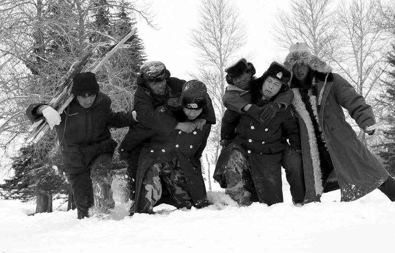 图为:新疆富蕴县救援人员背着两名被困哈萨克族牧民在雪中艰难前行